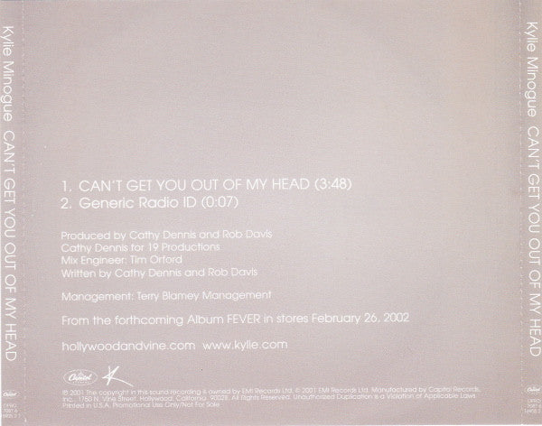 Kylie Minogue Can't Get You Out Of My Head PROMO MUSIC CD Generic 2tk electronic