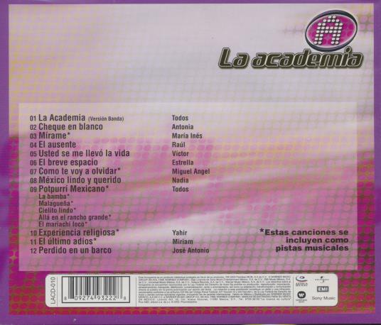 La Academia is a Mexican television music talent series that produced compilation albums featuring contestants from the show. This release collects performances by season contestants spanning Latin pop and traditional Mexican repertoire, presented in banda and mariachi arrangements as well as pop interpretations. The album includes solo highlights from Antonia, Maria Inés, Raúl, Víctor, Estrella, Miguel Ángel, Nadia, Yahir, Miriam and José Antonio, plus group performances. Overall the record blends contemporary pop production with classic regional Mexican songs.