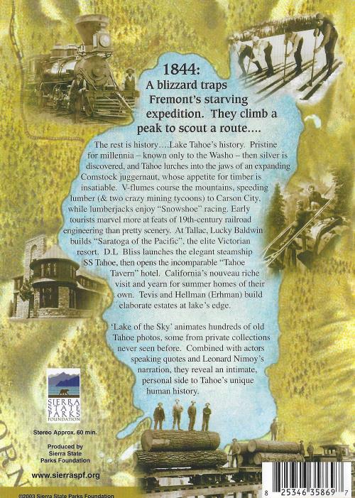 1844: A blizzard traps Fremont's starving expedition. They climb a peak to scout a route.... The rest is history....Lake Tahoe's history. Pristine for millennia — known only to the Washo — then silver is discovered, and Tahoe lurches into the jaws of an expanding Comstock juggernaut, whose appetite for timber is ) insatiable. V-flumes course the mountains, speeding lumber (& two crazy mining tycoons) to Carson City, while lumberjacks enjoy "Snowshoe" racing. Early tourists marvel more at feats of 19th-century railroad engineering than pretty scenery. At Tallac, Lucky Baldwin builds "Saratoga of the Pacific", the elite Victorian resort. D.L Bliss launches the elegant steamship SS Tahoe, then opens the incomparable "Tahoe Tavern" hotel. California's nouveau riche visit and yearn for summer homes of their own. Tevis and Hellman (Erhman) build elaborate estates at lake's edge. `Lake of the Sky' animates hundreds of old Tahoe photos, some from private collections never seen before. Combined with actors speaking quotes and Leonard Nimoy's narration, they reveal an intimate, personal side to Tahoe's unique human history. SIERRA I STATE PARKS Stereo Approx. 120 min.