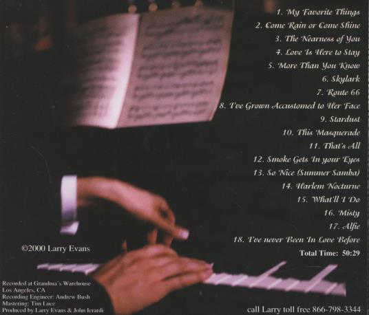 Larry Evans at nine years old begged his mother, a piano teacher herself, to learn the piano and has never stopped since. At 18 he was already playing for large crowds at the Elks Club in Michigan where he grew up. He played Friday nights with a repetoire of 52 songs memorized. At 19 Larry went to audition to accompany for a full musical production of 'Carnival' The director, who was new that night, thought that Larry was the regular pianist and said 'okay everyone,let's run the entire show!' Larry, being young and not knowing what an audition entailed, SIGHT READ AND PERFORMED THE ENTIRE 1 & 1/2 hour SHOW ON THE SPOT! Tracklist
