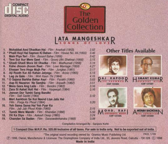 Lata Mangeshkar is one of India’s most celebrated playback singers, known for her timeless contributions to film melodies and Indian classical music. A treasure of unforgettable film melodies. The original sound recording owned by Gramco Music Publishing Ltd. Compilation arranged by Sanjeev Kohli.