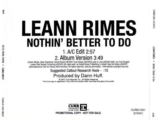 LeAnn Rimes: Nothin' Better To Do Promo w/ Back Artwork