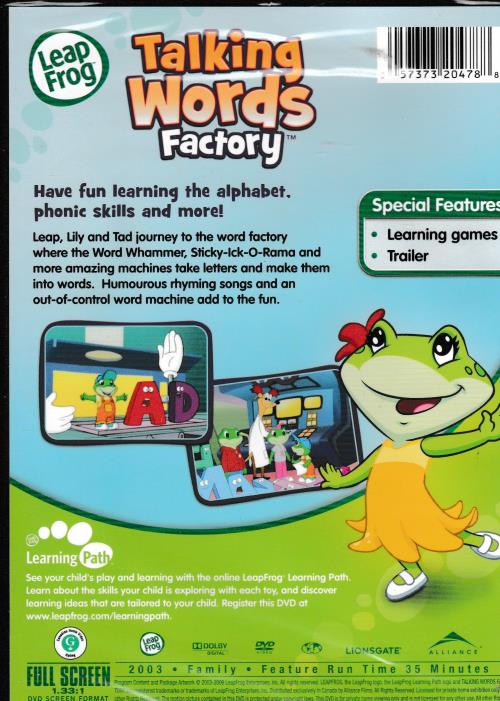 In this installment of the enormously popular LeapFrog educational series, Leap, Lily, and Tad arrive at the magical Talking Words Factory, where wacky machines such as the Word Whammer and the Sticky-Ick-O-Rama help the gang learn how words are formed. The real adventure starts, though, when one of the word machines goes haywire! For children aged three to six, TALKING WORDS FACTORY teaches vowels, consonants, word-building, rhyming, and vocabulary.