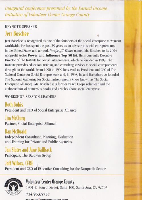Learning To Fish: Entrepreneurial Strategies For SustainabilityInaugural conference presented by the Earned Income Initiative of Volunteer Center Orange County KEYNOTE SPEAKER Jerr Boschee Jerr Boschee is recognized as one of the founders of the social enterprise movement worldwide. He has spent the past 25 years as an advisor to social entrepreneurs in the United States and abroad. Nonprofit Times named Mr. Boschee to its 2004 nonprofit sector Power and Influence Top 50 list. He is currently Executive Director of The Institute for Social Entrepreneurs, which he founded in 1999. The Institute provides education, training and consulting services to social entrepreneurs throughout the world. From 1990 to 1999 he served as President and CEO of The National Center for Social Entrepreneurs and, in 1998, he and five others co-founded The National Gathering for Social Entrepreneurs (now known as The Social Enterprise Alliance).