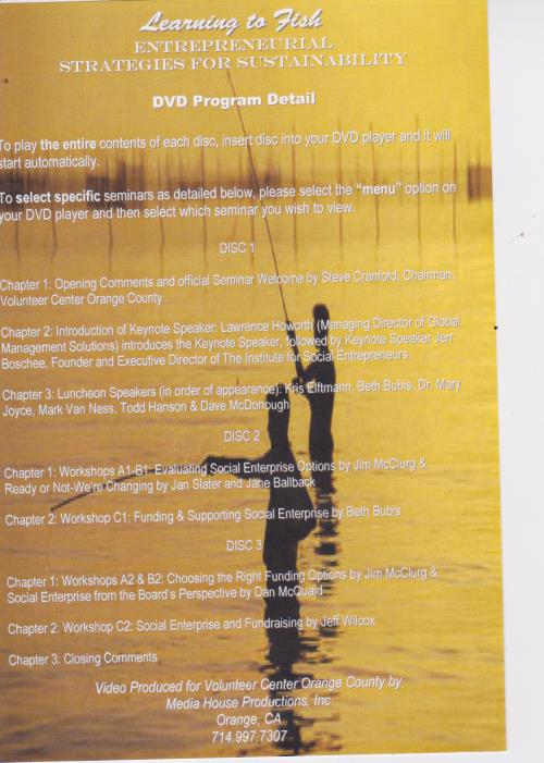 DISC 1 Chapter 1: Opening Comments and official Seminar Welco Volunteer Center Orange County Chapter 2: Introduction of Keynote Speaker: Lawren Management Solutions) introduces the Keynote Spea Boschee, Founder and Executive Director of The Institute Chapter 3: Luncheon Speakers (in order of appeartilftm Joyce, Mark Van Ness, Todd Hanson & Dave M ugh DIS Chapter 1 Workshops Al-B1: Evaluating Social Enterprise ion Ready or Not-We're Changing by Jan Slagrabli Ballbask Chapter 2: Workshop Cl:Funding & Supporting I Enterprise t B DISC 3 Chapter 1: Workshops A2 & B2: Choosing the Right Funding Options by Jim Social Enterprise from the Board's Perspective by Dan McQuaid Chapter 2: Workshop C2: Social Enterprise and Fundraising by Jeff Wilcox Chapter 3: Closing Comments