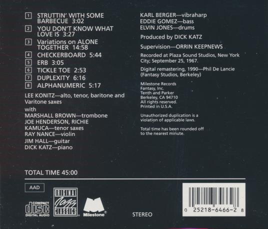 Produced by Dick Katz. Supervision by Orrin Keepnews. Recorded at Plaza Sound Studios, New York City; September 25, 1967. Digital remastering 1990 — Phil De Lancie (Fantasy Studios, Berkeley). Milestone Records, Fantasy, Inc. Printed in U.S.A.