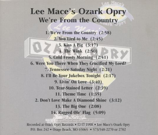 Lee Mace's Ozark Opry delivers traditional country music infused with the unique sounds and storytelling of the Ozark region. Their style features heartfelt lyrics and classic country instrumentation. Recorded at Ozark Opry Records © 1998 Lee Mace's Ozark Opry