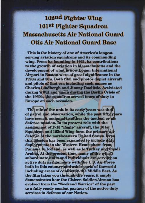 This is the history of one of America's longest serving aviation squadrons and its commanding wing. From its founding in 1921, its contributions to the growth of aviation in Massachusetts and the development of what is now Logan International Airport in Boston were of great significance in the 1920's and 30's. Both film and photos depict aircraft and pilots of that era including such names as Charles Lindberg and Jimmy Doolittle. Activated during WWII and again during the Berlin Crisis of the 1960's, the squadron served tours of duty in Europe on each occasion.The role of the unit in its early years was that of patrol and observation, while the past fifty years have seen it assigned to either the tactical or air defense mission. In its present role with the assignment of F-15 "Eagle" aircraft, the 101st Squadron and 102nd Wing form the primary air defense of the northeastern United States. Even this mission has been expanded to include duty deployments in the Western Hemisphere from Panama to Iceland, as well as to Turkey and Saudi Arabia. At the present time, many of the wing's subordinate units and individuals are serving on active duty assignments with the U.S. Air Force both in this country and other parts of the world including areas of conflict in the Middle East. As the film takes you through the years, it amply demonstrates how the Citizen Soldier/Airman has evolved from the "Weekend Warrior" of the past to a fully ready combat partner of the active duty services in defense of our Nation.