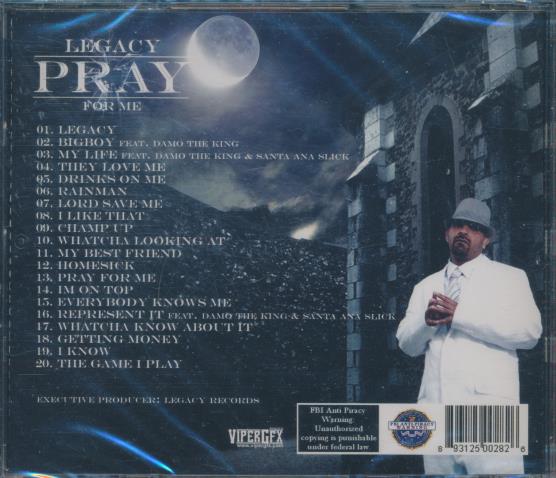 Legacy is a hip hop artist who fronts this release Pray For Me. The album blends introspective lyrics with street oriented themes and uplifting hooks. Several tracks feature collaborations with Damo The King and Santa Ana Slick. Production is contemporary hip hop with soulful and atmospheric elements.