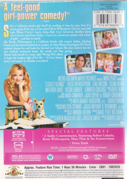 Elle Woods (Witherspoon) is a California blonde with couture clothes, fabulous friends, and the hottest boyfriend on campus. So when Warner Huntington III suddenly dumps her and heads for Harvard Law School, Elle takes matters into her own perfectly manicured hands. She enrolls too!