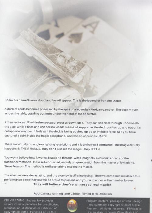 A deck of cards becomes possessed by the spirit of a legendary Mexican gambler. The deck moves across the table, crawling out from under the hand of the spectator.