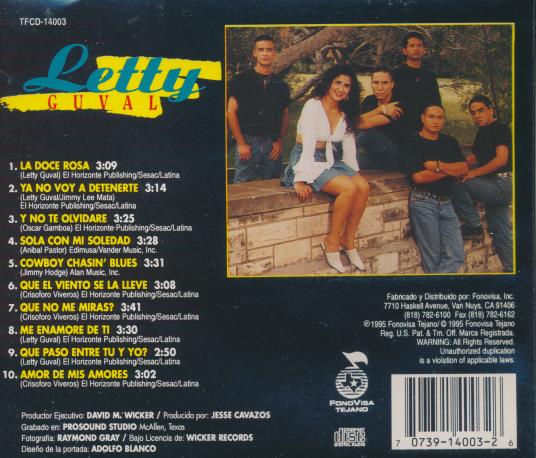 Letty Guval is a Tejano singer whose album mixes romantic ballads with upbeat regional numbers. Her vocals are front and center across arrangements that draw on traditional Tejano instrumentation and contemporary production. The album features original songs and selections that showcase both tender lyricism and danceable rhythms. This release highlights her as a rising voice in mid 1990s Tejano music.