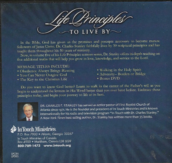 In the Bible, God has given us the promises and precepts necessary to become mature followers of Jesus Christ. Dr. Charles Stanley faithfully lives by 30 scriptural principles and has taught them throughout his 50 years of ministry. Now, in volume five of his Life Principles sermon series, Dr. Stanley offers in-depth teaching on five additional truths that will help you grow in love, knowledge, and service to the Lord. MESSAGE TITLES INCLUDE: • Obedience Always Brings Blessing • You. Can Never Outgive God • The Key to the Christian Life • Walking in the Holy Spirit • Adversity— Burden or Bridge • Bonus DVD Do you want to know God better? Learn to walk in the center of the Father's will as you begin to understand the lessons in His Word better than you ever have before. Embrace these principles today, and begin your journey to life at its best. DR.
