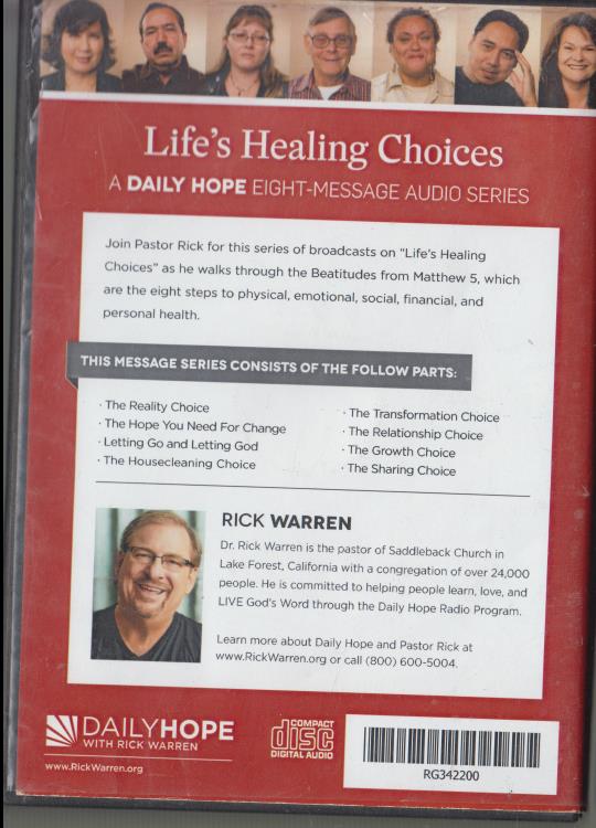 Join Pastor Rick Warren for this series of broadcasts on Life's Healing Choices as he walks through the Beatitudes from Matthew 5. These teachings present eight steps to improved physical, emotional, social, financial, and personal health.