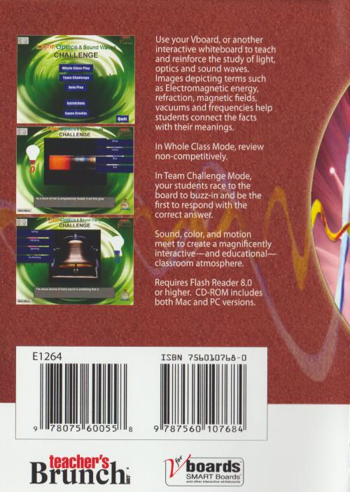 Use your Vboard, or another interactive whiteboard to teach and reinforce the study of light, optics and sound waves. Images depicting terms such as Electromagnetic energy, refraction, magnetic fields, vacuums and frequencies help students connect the facts with their meanings. In Whole Class Mode, review non-competitively. In Team Challenge Mode, your students race to the board to buzz-in and be the first to respond with the correct answer. Sound, color, and motion meet to create a magnificently interactive—and educational—classroom atmosphere. Requires Flash Reader 8.0 or higher. CD-ROM includes both Mac and PC versions.