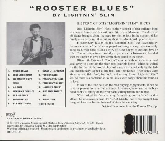 Lightnin' Slim: Rooster Blues MUSIC AUDIO CD Louisiana Blues 1998 Hip-O Records