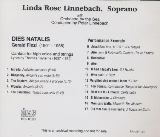 Linda Rose Linnebach: Finzi: Dies Natalis MUSIC AUDIO CD classical soprano! BBS