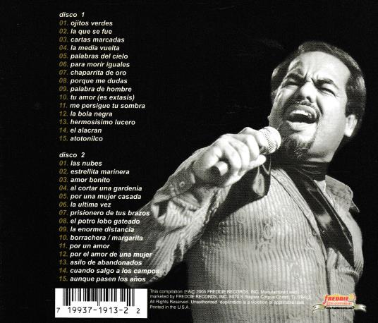 disco 1 01. ojitos verdes 02. la que se fue 03. cartas marcadas 04. la media vuelta 05. palabras de/ cielo 06. para morir iguales 07. chaparrita de oro 08. porque me dudas 09. palabra de hombre 10. tu amor (es extasis) 11. me persigue tu sombra 12. la bola negra 13. hermosisimo lucero 14. el alacran 15. atotonilco disco 2 u las nubes 02. estrellita marinera 03. amor bonito 04, al cortar una gardenia 05. por una mujer casada 06 la ultima vez prisionero de tus brazos el potro lobo gateado 09. la enorme distancia 10. borrachera / margarita 11. por un amor 12. por el amor de una mujer 13. asi/o de abandonados 14. cuando salgo a los campo 15. aunque pasen los anos