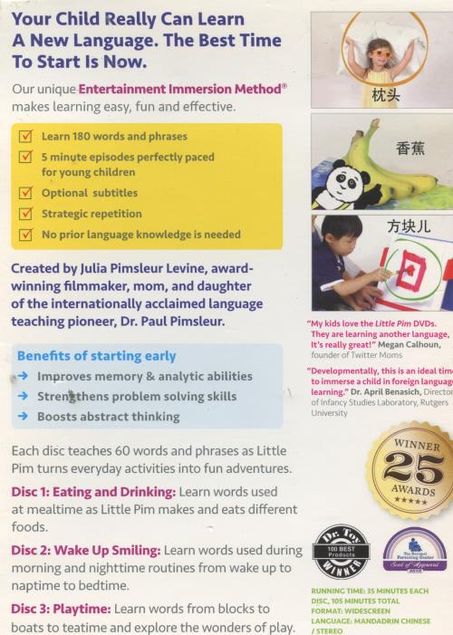 Each disc teaches 60 words and phrases as Little Pim turns everyday activities into fun adventures.
