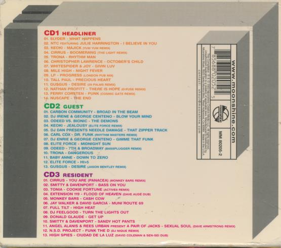 3x mix CD - 40x tracks. Mixed compilation released by Moonshine Music. Compilation divided into CD1 Headliner, CD2 Guest and CD3 Resident.