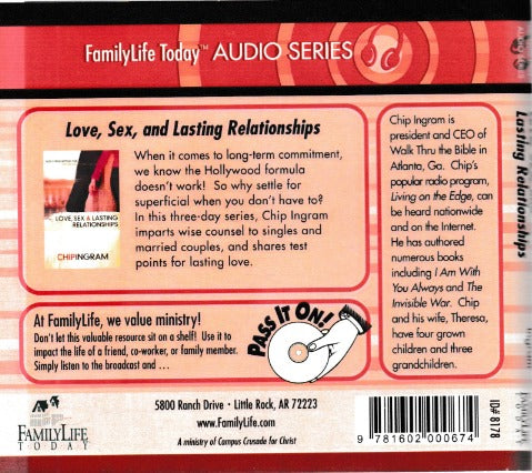 Love, Sex, and Lasting Relationships When it comes to long-term commitment, we know the Hollywood formula doesn't work! So why settle for superficial when you don't have to? In this three-day series, Chip Ingram imparts wise counsel to singles and married couples, and shares test points for lasting love.