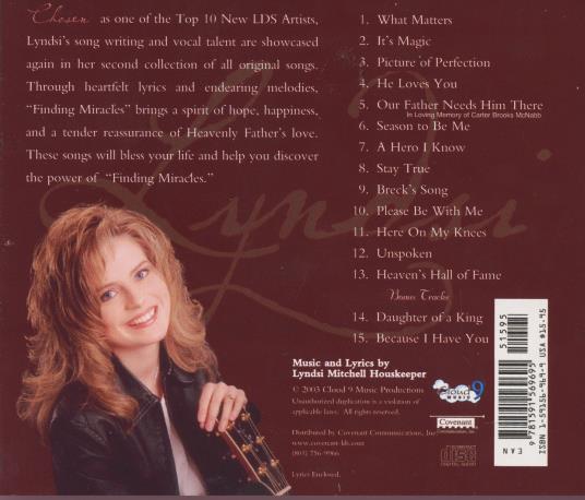 Lyndsi Mitchell Houskeeper is showcasing her songwriting and vocal talent in this second collection of original songs. Through heartfelt lyrics and endearing melodies, 'Finding Miracles' brings a spirit of hope, happiness, and a tender reassurance of Heavenly Father's love.