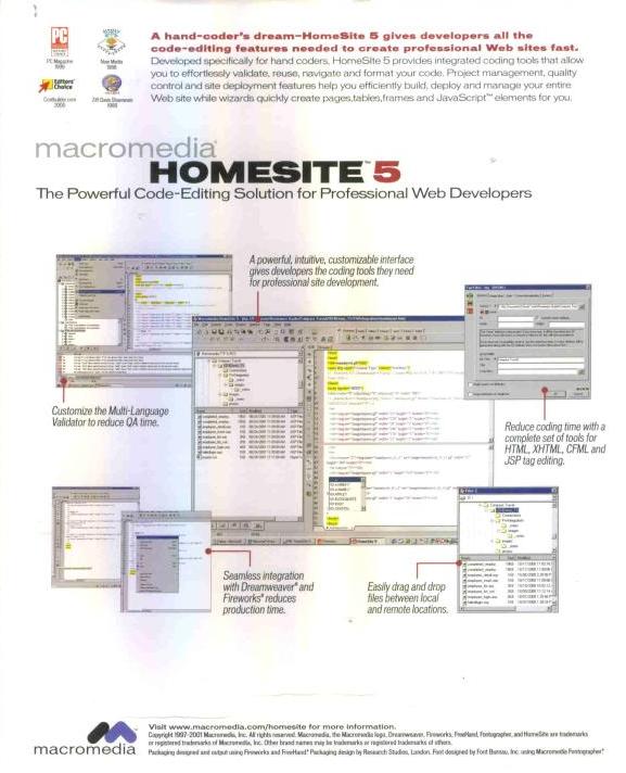 Developers can create professional Web sites fast with the code editing features of Macromedia HomeSite 5. The software delivers advanced hand coding features, productivity-enhancing wizards, and a customizable user interface to efficiently build, deploy, and manage your entire Web site. Effortlessly validate, reuse, navigate, and format your code with integrated coding tools. The wizards quickly create pages, tables, frames, and JavaScript elements for you.