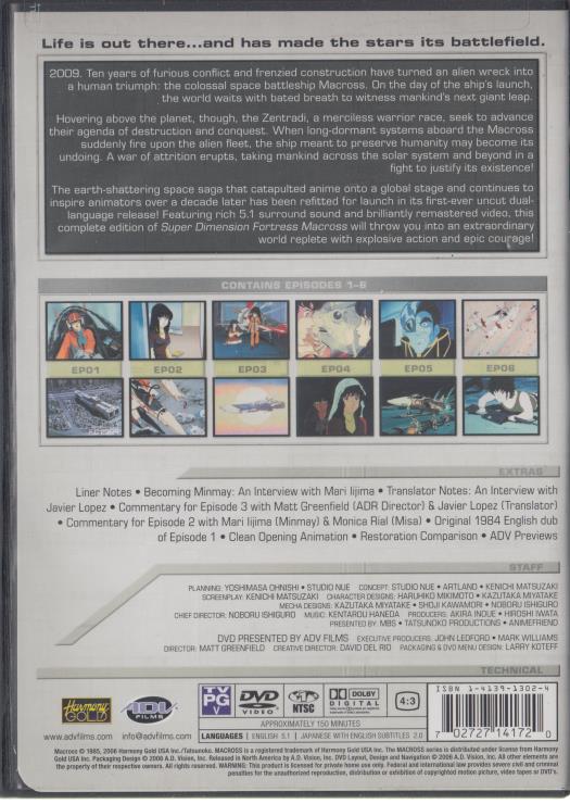 Presentation notes: Dual-language audio options and remastered video make this a definitive release for early episodes of the classic Macross saga. Includes episode gallery and packaging artwork.
