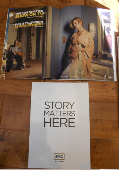 This AMC Emmy “For Your Consideration” promotional Large-Format book includes a large cardboard booklet, and five (5) DVDs. Two DVDs containing 6 Mad Men episodes, two DVDs containing 6 Breaking Bad episodes, and one DVD with a STORYTELLERS episode.