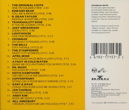 In some cases rights have been secured where master tapes, as alluded to earlier, were not always available. Tracks that fall into this category have been remastered using a vinyl disc. They are marked with an asterisk. There are currently 3 volumes in the 'Made in Canada' series. All 3 are available on compact disc, cassette and long playing record.