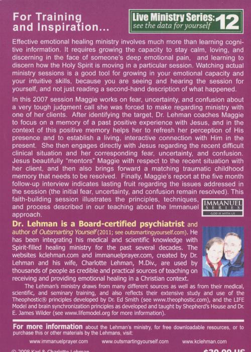 In this session from 2007, Maggie faces fear, uncertainty, and confusion arising from a challenging decision she had to make regarding ministry with a client. Guiding her, Dr. Lehman encourages Maggie to revisit a positive encounter with Jesus from her past. Through this memory, Maggie renews her perception of His presence, establishing a dynamic connection with Him in the present moment. She engages directly with Jesus about the recent clinical challenge and her accompanying emotions. Jesus provides guidance to Maggie regarding the client situation and surfaces a related childhood trauma for resolution. Maggie's report during the five-month follow-up interview indicates sustained progress on the addressed issues, with the initial fear, uncertainty, and confusion now resolved.