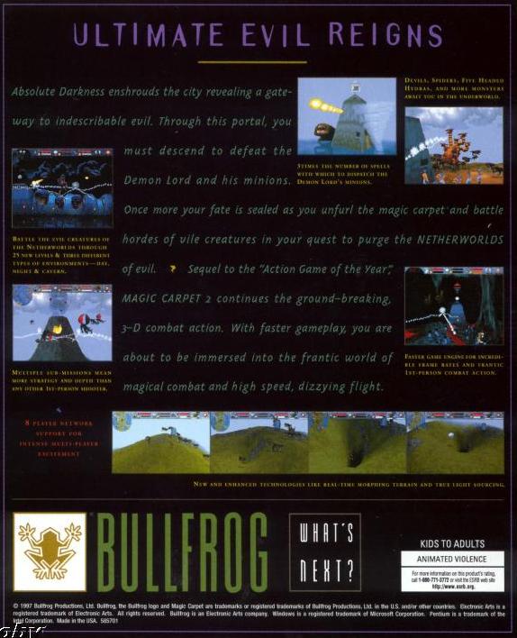 Magic Carpet 2: The Netherworlds is the sequel to Magic Carpet and uses a new 3D engine to produce better looking graphics. New spells and monsters are also included. It's an action game with some elements from other genres thrown into the mix. The biggest part of the gameplay is FPS action. You fly around on your magic carpet, clearing levels by killing monsters and battling other wizards. Instead of guns, you use offensive spells like fireball, meteor, lightning, tornado etc.