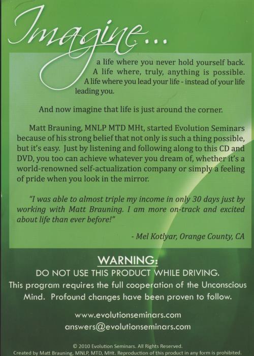 Matt Brauning, MNLP MTD MHt, started Evolution Seminars because of his strong belief that not only is such a thing possible, but it's easy. Just by listening and following along to this CD and DVD, you too can achieve whatever you dream of, whether it's a world-renowned self-actualization company or simply a feeling of pride when you look in the mirror.