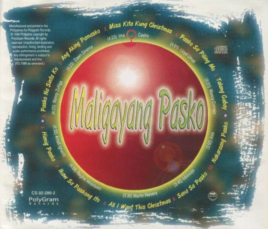 This album is a compilation of original Filipino Christmas songs performed by various artists, showcasing the vibrant and festive spirit of the Philippines during the holiday season. Manufactured and printed in the Philippines by PolyGram Records.