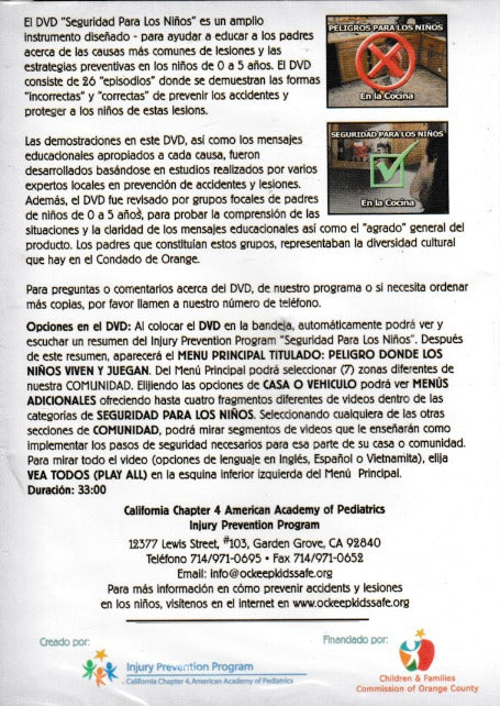 Seguridad Para Los Niños es un amplio instrumento diseñado para ayudar a educar a los padres sobre las causas más comunes de lesiones y las estrategias preventivas en niños de 0 a 5 años. El DVD consiste de 26 episodios donde se demuestran las formas incorrectas y correctas de prevenir los accidentes y proteger a los niños de estas lesiones.