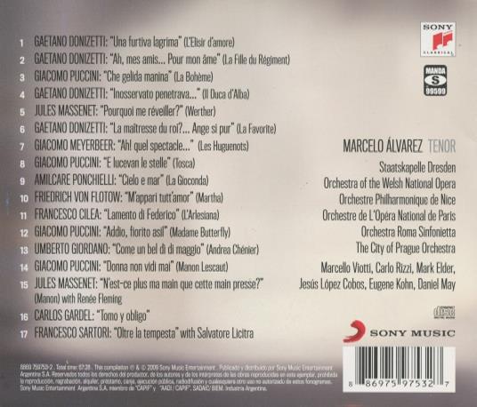 Marcelo Álvarez is an internationally acclaimed Argentine lyric tenor known for his warm tone and expressive operatic interpretations. This collection showcases his signature arias from the Italian and French repertory, performed with major European orchestras. The album features a mix of Puccini, Donizetti, Massenet and other beloved composers, emphasizing Alvarez's lyrical line and dramatic nuance. Accompanied by distinguished conductors and ensembles, the record highlights his versatile, emotive vocal style across a variety of operatic highlights.