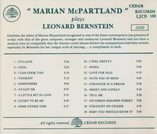 Marian McPartland: Plays Leonard Bernstein MUSIC AUDIO CD jazz piano swing Cedar