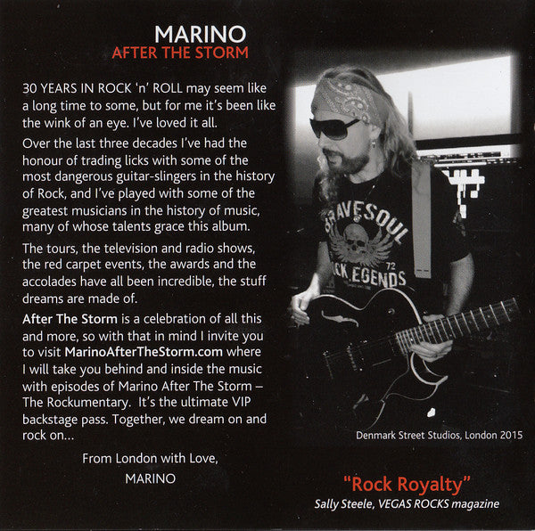 Awesome studio disc by this excellent guitarist from the UK featuring 10 tracks of top-shelf, dynamic, blues-based, heavy guitar rock music of world class proportions. Marino is an authentic, seasoned six string axeslinger who rocks the blues with soul & passion and on After The Storm the British guitar hero lands with his best/strongest disc to date. Marino has been kicking ass on the guitar since the early 80s opening for the likes of Thin Lizzy, Robert Plant, Johnny Winter, Mick Ralphs, Steve Marriott, Ian Gillan and many others through the years including jamming on stage with Carlos Santana at the Hammersmith Odeon. The Marino: After The Storm CD is a well-produced musical document that includes a cast of superb professional musicians. Highly Recommended to fans of serious, high quality, melodic, retro-sonic, guitar rock excellence.