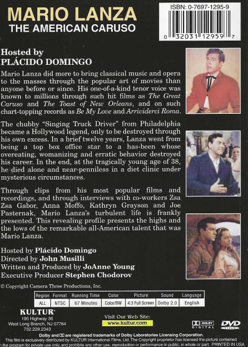 Mario Lanza did more to bring classical music and opera to the masses through the popular art of movies than anyone before or since. His one-of-a-kind tenor voice was known to millions through such hit films as The Great Caruso and The Toast of New Orleans, and on such chart-topping records as Be My Love and Arrividerci Roma. The chubby "Singing Truck Driver" from Philadelphia became a Hollywood legend, only to be destroyed through his own excess. In a brief twelve years, Lanza went from being a top box office star to a has-been whose overeating, womanizing and erratic behavior destroyed his career. In the end, at the tragically young age of 38, he died alone and near-penniless in a diet clinic under mysterious circumstances. Through clips from his most popular films and recordings, and through interviews with co-workers Zsa. Zsa Gabor, Anna Moffo, Kathryn Grayson and Joe Pasternak, Mario Lanza's turbulent life is frankly presented. This revealing profile presents the highs and the lows of the remarkable all-American talent that was Mario Lanza.
