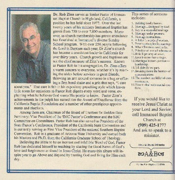 Marriage & The Family (22 Disc Set)Dr. Rob Zinn serves as Senior Pastor of Imman-uel Baptist Church in High-land, California, a position he has held since 1977. Over the last twenty years of his ministry Immanuel Baptist has grown from 730 to over 7,000 members. More-over, as church membership has grown attendance has flourished at Immanuel's diverse Sunday School program. With over 250 people following the Lord in Baptism each year, Dr Zinn's church has become a consistent leader in California for over thirty years. Church growth and baptisms are not the chief measure of Zinn's success. Known as Pastor Rob to his congregation, Dr. Zinn offers a warm concern to everyone, whether it's by roam-ing the aisles before services to greet friends, throwing an arm around someone in a hug or offer-ing a firm hand shake and a grin that says, "I care about you."