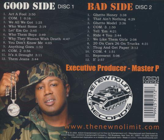 Master P is a prominent rapper and entrepreneur who founded No Limit Records and helped popularize Southern hip hop. Good Side Bad Side is a double-disc release that showcases both introspective songs and harder street-oriented tracks. The album balances gritty narratives with club-ready beats and melodic hooks. Production reflects the Southern hip hop sound with raw, streetwise lyrics delivered in Master P's distinctive cadence.