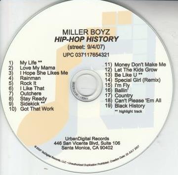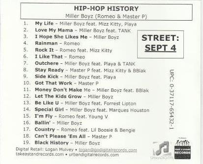 1. My Life - Miller Boyz feat. Mizz Kitty, Playa 2. Love My Mama - Miller Boyz feat. TANK 3. I Hope She Likes Me - Miller Boyz 4. Rainman - Romeo 5. Rock It - Romeo feat. Mizz Kitty 6. I Like That - Romeo 7. Outchere - Miller Boyz feat. Playa & TANK 8. Stay Ready - Master P feat. Mizz Kitty & BBlak 9. Side Kick - Miller Boyz feat. Playa 10. Got That Work - Master P 11. Money Don't Make Me - Miller Boyz feat. BBlak 12. Let The Kids Grow - Miller Boyz 13. Be Like U - Miller Boyz feat. Forrest Lipton 14. Special Girl - Miller Boyz feat. Marques Houston (Remix) 15. I'm Fly - Romeo feat. Young V 16. Bailin' - Miller Boyz 17. Country - Romeo feat. Lil Boosie & Bengie 18. Can't Please 'Em All - Master P 19. Black History - Miller Boyz