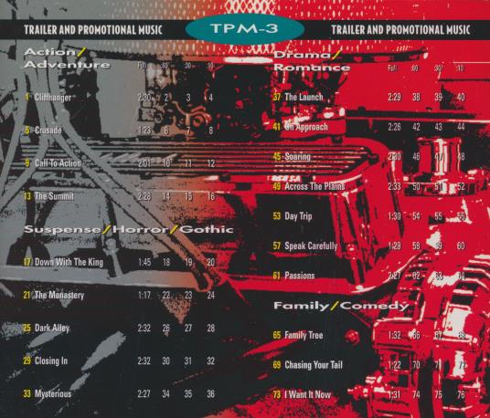 Series: Trailer and Promotional Music (TPM-3). Compilation of production and trailer cues grouped by mood: Action/Adventure, Suspense/Horror/Gothic, Drama/Romance, Family/Comedy.