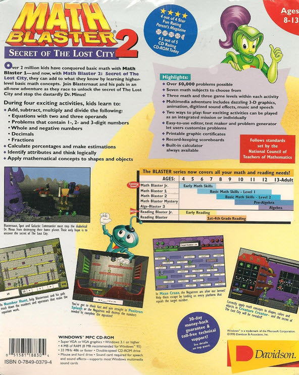 Math Blaster 2: Secret Of The Lost City PC CD add subtract multiply divide game!