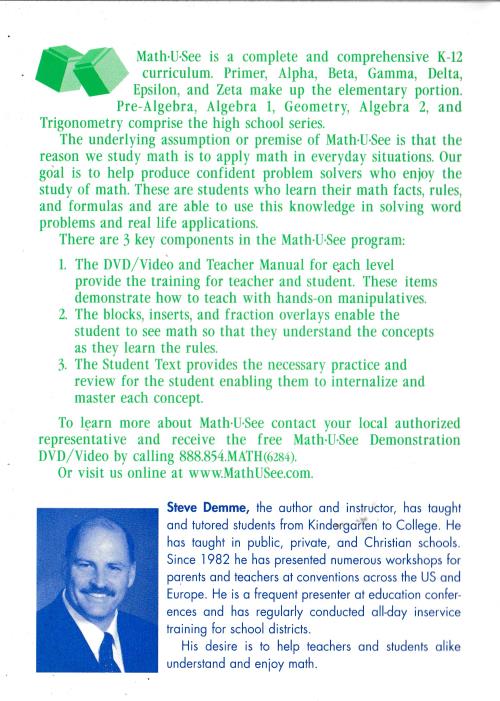 Steve Demme, creator of Math U-See, combines hands-on methodology with incremental instruction and continual review in this manipulative-based program. It excels in its hands-on presentation of math concepts that enables students to understand how math works.