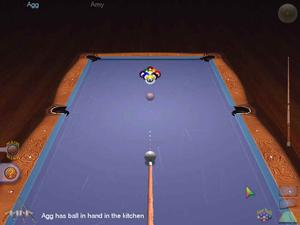 Classic games include Basic Pocket Billiards, Carom Billiards, Cutthroat, Eight Ball, Nine Ball, Snooker, and Rotation, playable on uniquely shaped tables or the standard rectangular venue. Difficulty settings control the distance of the "target ball" aid, and features include a ball identifier, auto aim, fine tuning, a quick shoot option, table view adjustments, ball spin, undo and redo options, turn passing, quick reference control card, and resigning.