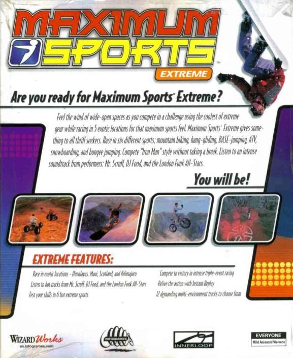 Maximum Sports Extreme is designed to bring some of the excitement of truly extreme outdoor sports to the relative safety of the home computer. Gamers are encouraged to enjoy 3D renditions of bungee-jumping, hang-gliding, mountain biking, off-road racing, sky surfing, and snowboarding. Competitive players can also share their best runs over the internet, through uploadable "ghosts."