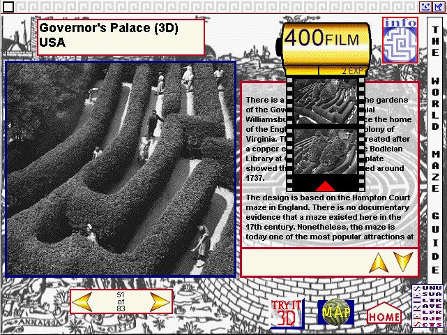 The 3-D Mazewalk. This interesting feature reminds one of the groundbreaking Wolfenstein 3d of old. A final aspect of Maze is the gallery, cataloging 84 different man sized mazes around the world, with addresses and phone numbers to contact for information. It is an interesting feature, and also comes with many extra photos of the mazes. So, all in all, Maze is a wonderful information tool, full of information on all aspects of mazes, their history, and their charm.
