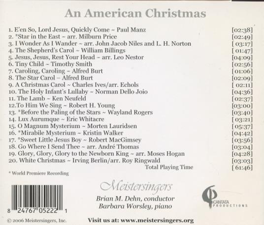 Meistersingers is a choral group performing classical and Christmas-themed music, featuring conductor Brian M. Dehn and pianist Barbara Worslep. World Premiere Recording
