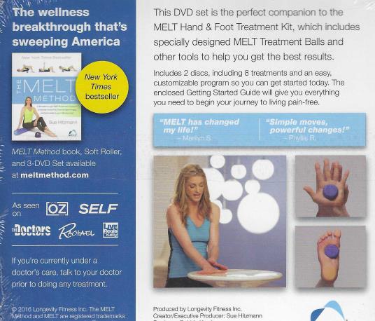 The wellness breakthrough that's sweeping America New York Times bestseller M-E-L-T Method book, Soft Roller, _ and 3-DVD If you're currently under a doctor's care, talk to your doctor prior to doing any treatment. This DVD set is the perfect companion to the M-E-L-T Hand & Foot Treatment Kit, which includes specially designed M-E-L-T Treatment Balls and other tools to help you get the best results. Includes 2 discs, including 8 treatments and an easy, customizable program so you can get started today. The enclosed Getting Started Guide will give you everything you need to begin your journey to living pain-free. An innovative self-treatment technique that can make your whole body feel better in just minutes! Featuring M-E-L-T Method creator. NMT Discover the secrets to pain-free living... at any age!